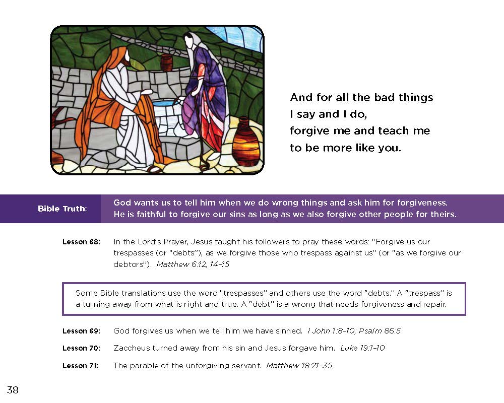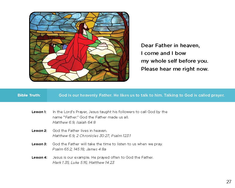The back of the book includes an easy to follow learning guide for parents that includes: Bible passages, summaries of each verse or passage, definitions, instructions for use, and child friendly stained glass windows as illustrations. As an extra bonus, the book ends with a list of all the known prayers of Jesus.